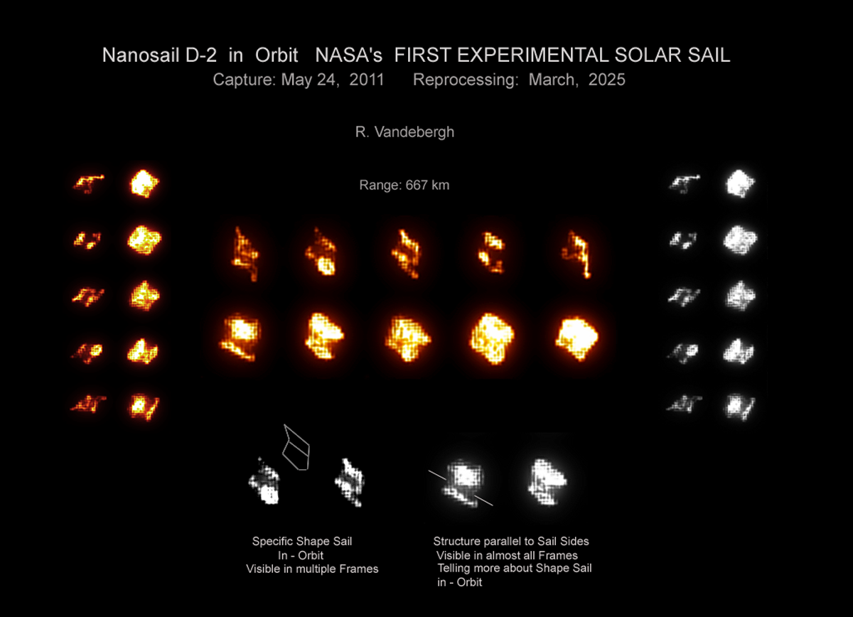 V roce 2011, 20. ledna, družice NASA NanoSail-D2 rozvinula velmi tenkou a velmi odrazivou plachtu o ploše 10 m2 a stala se tak první sluneční plachtou na nízké oběžné dráze Země. Plachtění vesmírem, které je často považováno za věc ze science fiction, navrhl před 400 lety astronom Johannes Kepler, který pozoroval ohony komet unášené slunečním větrem. Ale moderní sluneční plachetnice, jako je NanoSail-D2, japonská IKAROS nebo projekt Planetary Society Lightsail A, se spoléhají na malý, ale neustálý tlak samotného slunečního světla, který zajišťuje tah. Jak NanoSail-D2 kroužila kolem planety Země, tak se její plachta třpytila ve slunečním světle a byla pravidelně jasná a okem viditelná. Tyto pozoruhodně detailní snímky byly pořízeny ručním sledováním sluneční plachetnice na orbitě malým dalekohledem.