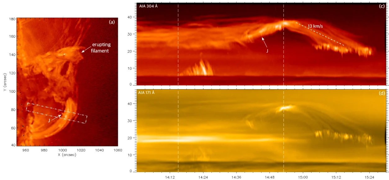 Nepovedená erupce filamentu z 3. 4. 2014 pozorovaná přístrojem AIA na družici SDO. Vlevo je obdélníkem vyznačena oblast, jejíž časový vývoj je pak vystižen na panelech vpravo. Zde svislá osa reprezentuje souřadnici podél zvolené umělé štěrbiny, zatímco ve vodorovném směru běží čas. Je dobře patrné, že filament se nejprve aktivuje a v atmosféře stoupá, přibližně ve 14:49 UT dosáhne maximální výšky nad povrchem a pak opět klesá zpět. Pozorování plazmatu horkého asi 50 000 stupňů (nahoře) a asi 1 milion stupňů (dole). Převzato z práce Kumar a kol., ApJ 943 (2023) 156, DOI:10.3847/1538-4357/acaea4.