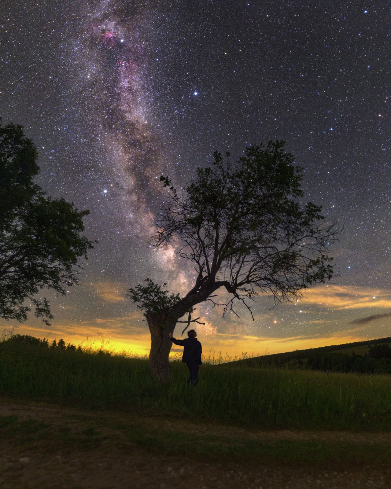 Stejně jako rybářovy rozpažené ruce, ukazující velikost jeho úlovku, tak i na snímku Petra Horálka rozprostírají svá „ramena“ dva astronomické útvary. Jednak Mléčná dráha, jednak zodiakální světlo. Ovšem pro nás středoevropany je obojí poněkud tajemné. Tak třeba ona Mléčná dráha. I když ji z naší oblohy známe, pohled do středu naší Galaxie, jejíž spirální ramena právě její jemný svit představuje, nám bývá buď úplně utajen nebo se objeví jen krátce a zlehka nad letním jižním obzorem. A zde … zde jej vidíme v plné kráse a ještě dále a jižněji … až tam dolů na jih, do oblastí viditelných třeba z Jižní Ameriky. Právě tam totiž snímek vznikl. Na půdě Evropské jižní observatoře na La Silla, na jejím úplném okraji, nejen za poslední kopulí, ale i za posledním baráčkem, který zajistil hlavně ochranu před větrem, který zde fouká často silněji než na vrcholcích našich hor.