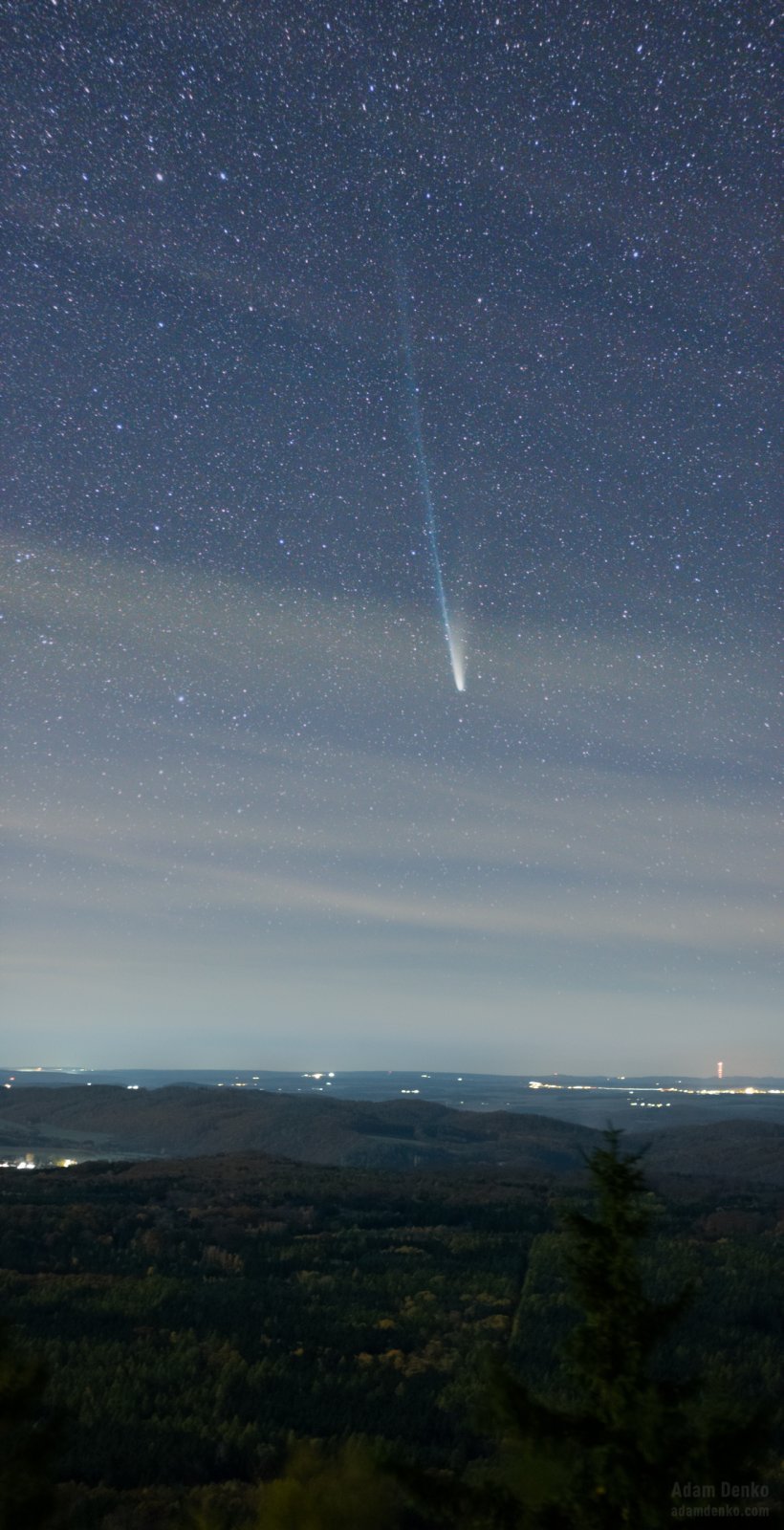 Autor této fotografie Daniel Kurtin využil „téměř“ jasné oblohy a nízké pozice komety nad obzorem k vytvoření zajímavé podzimní fotografické kompozice. Ohon komety na snímku dosahuje téměř 20°, a to i za jasného svitu Měsíce. Za zmínku stojí i (nebo možná zejména) nádherně vykreslený protichvost, mířící směrem ke Slunci.