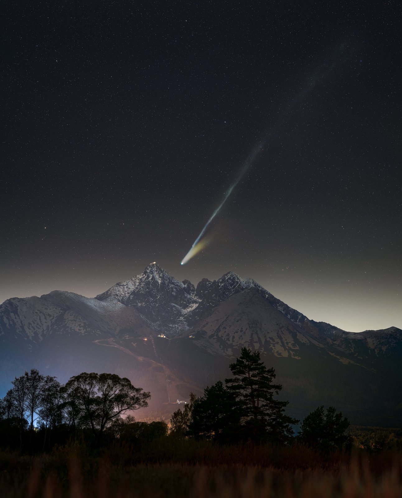 Fotografie zachycuje kometu nad zasněženými horskými vrcholy a astronomickými observatořemi. Snímek vznikl jako mozaika z více polí, přičemž zachovává reálné proporce krajiny i komety.