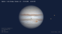 Jupiter s GRS a měsíčky, z nichž jeden vrhá stín do světlé rovníkové zóny Jupitera.
