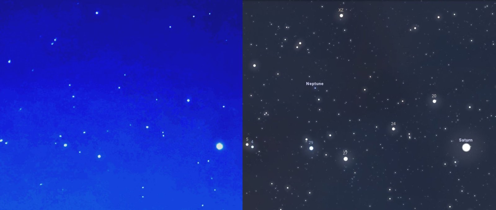Neptun a Saturn iPhonem 15 Pro Max. Mapa ze stellarium-web.org.