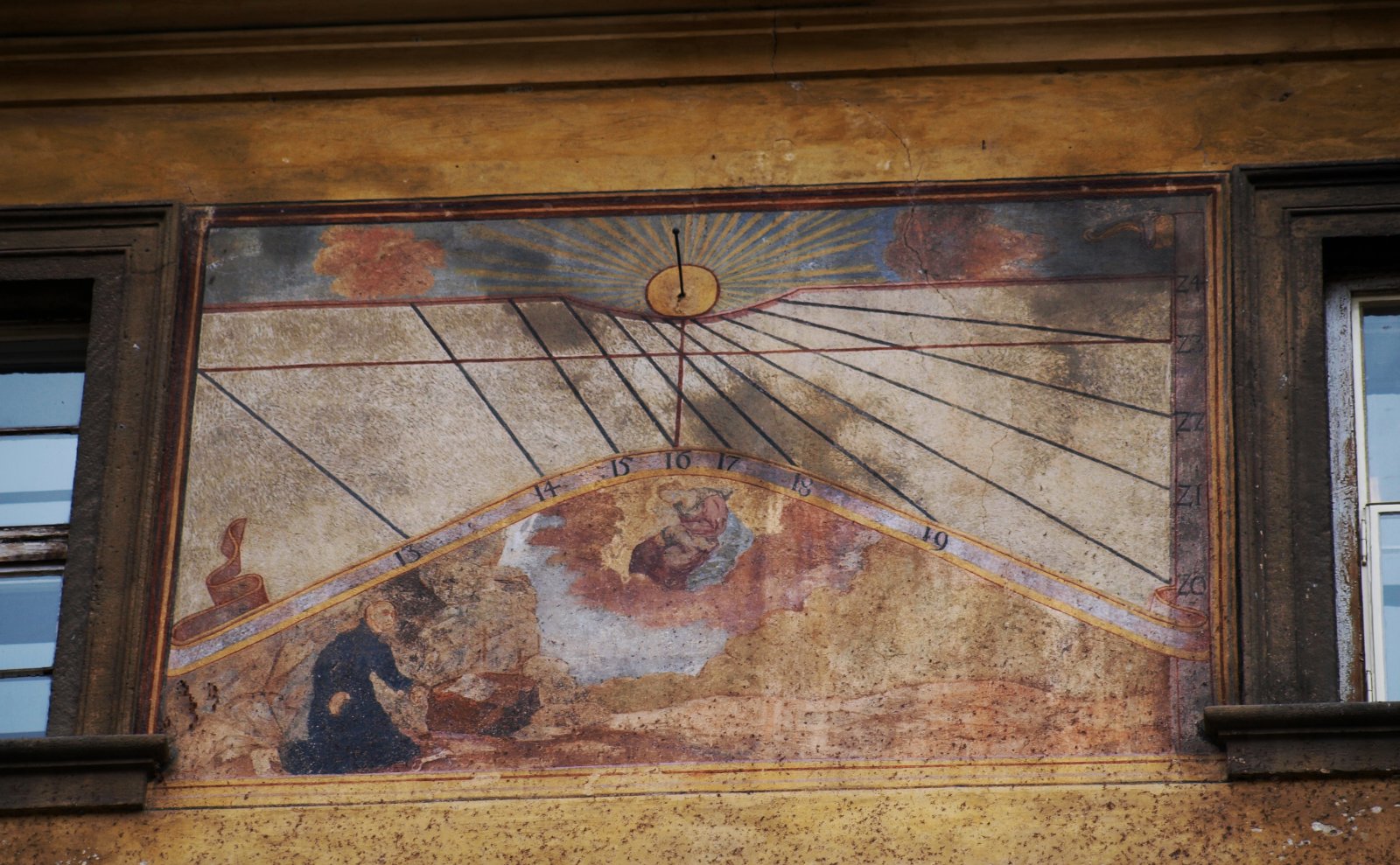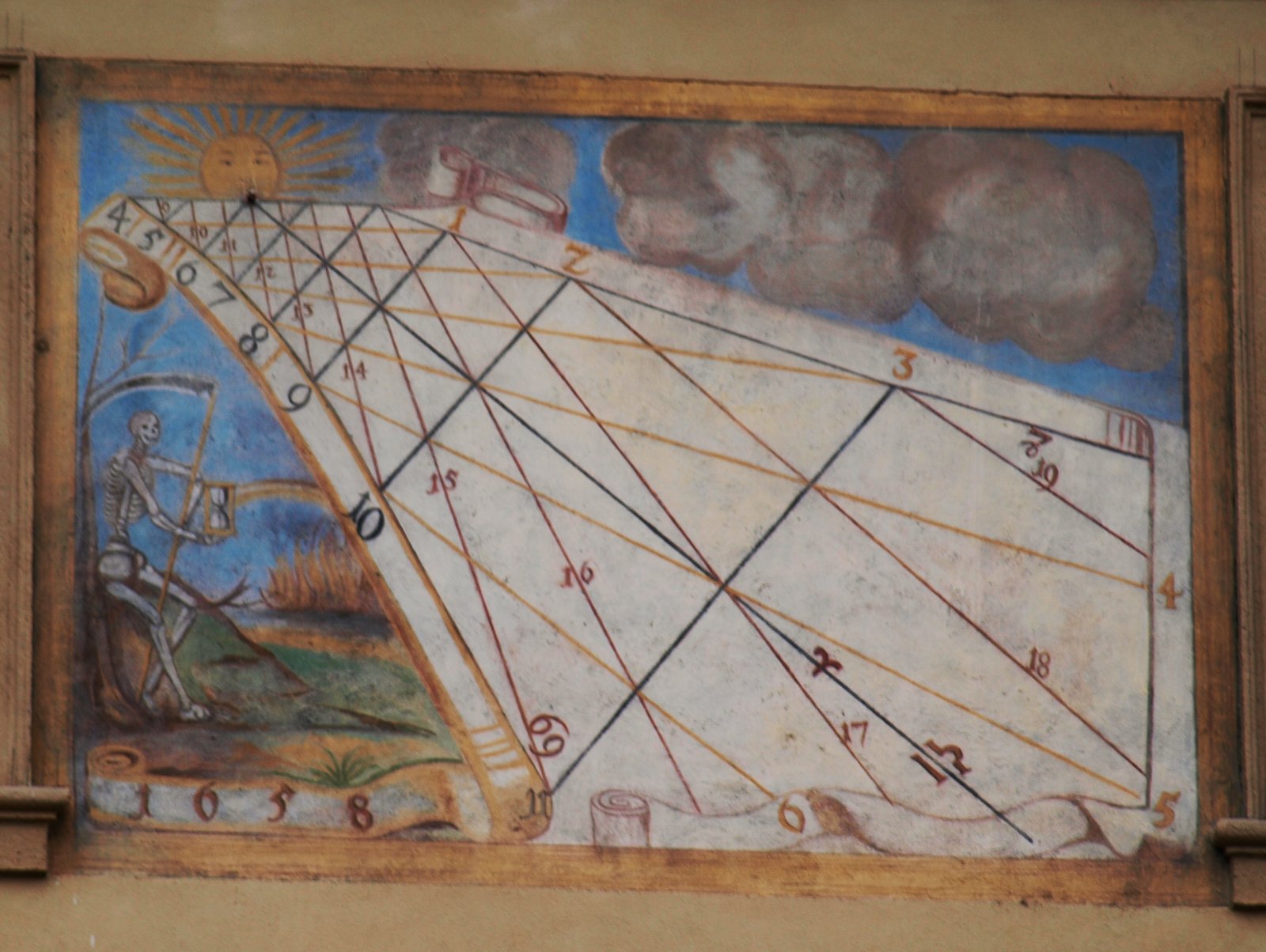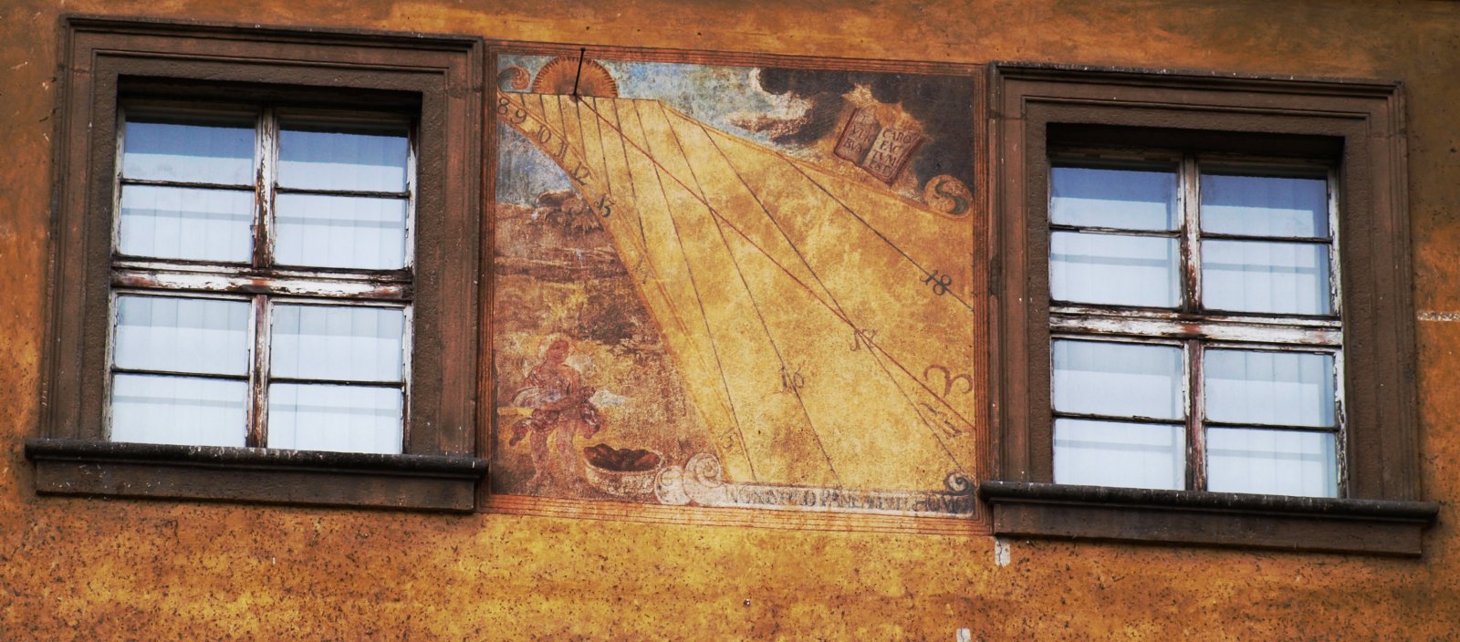 Svislé sluneční hodiny z roku 1808 musely projít rekonstrukcí a tak dnes vypadají jako nové.