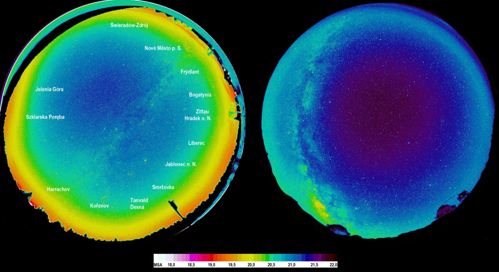 „Obloha je zde tak tmavá, že vidíme i slabý svit jinak neviditelných jevů, jako je zvířetníkový pás a protisvit, který způsobuje prach ve sluneční soustavě nasvícený slabě Sluncem“, vysvětluje Mašek. „Jak můžeme na obarveném snímku z Jizerky vidět, nestačí jen správně svítit v oblastech tmavé oblohy. Světelné znečištění zde způsobují především velká města, jako jsou Liberec, Jablonec nad Nisou nebo města v Polsku. Kromě nadměrného svícení je třeba hlídat i vhodnou barvu světla, všechna svítidla musí být plně cloněná a svítit pouze dolu. Oranžovější například nenaruší tolik noční životní prostředí jako bílé LED s velkým podílem modré složky. Na La Palmě se svítí velmi šetrnými PC Amber LED s výrazně oranžovým světlem, jako měly sodíkové výbojky. Proto je zde obloha méně zasažena světlem měst, neboť modré světlo se v atmosféře rozptyluje nejvíce“, komentuje to Martin Mašek.