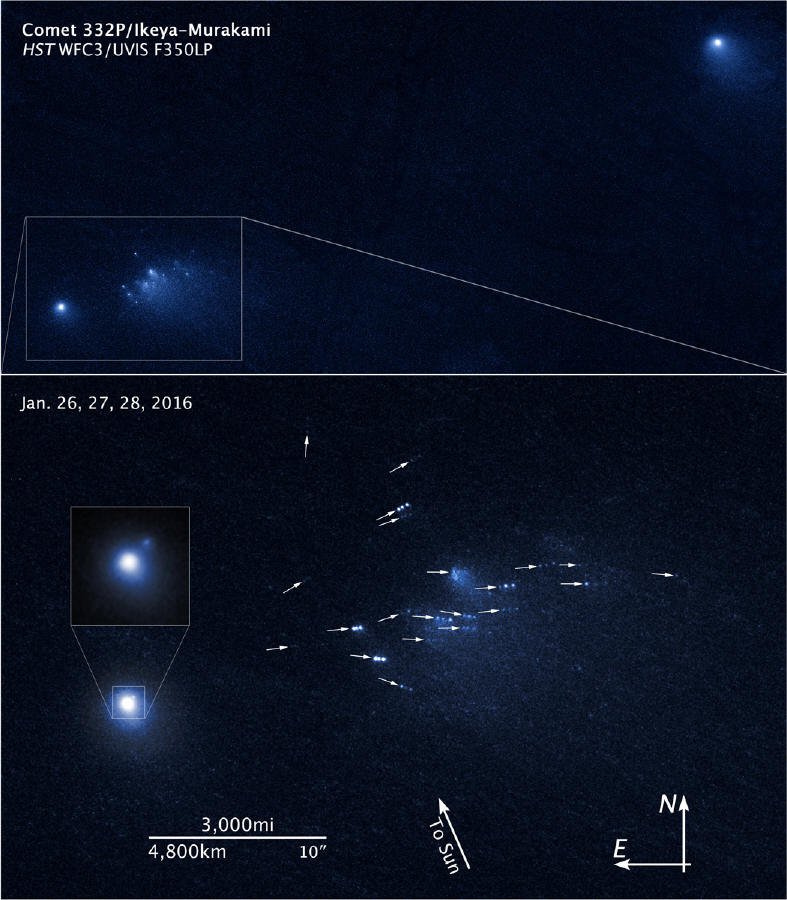Díky tomu, že Hubbleův ostrý zrak dokáže rozeznat extrémně jemné detaily, mohl tým vysledovat historii úlomků až do doby, kdy tvořily jeden celek. To jim umožnilo rekonstruovat časovou osu. Při tom však odhalili záhadu: proč došlo ke zpoždění mezi rozpadnutím komety a okamžikem, kdy byla pozorována zjasnění komety dalekohledy ze Země? Když se kometa roztříštila a odhalila čerstvý led, proč se nezjasnila téměř okamžitě?