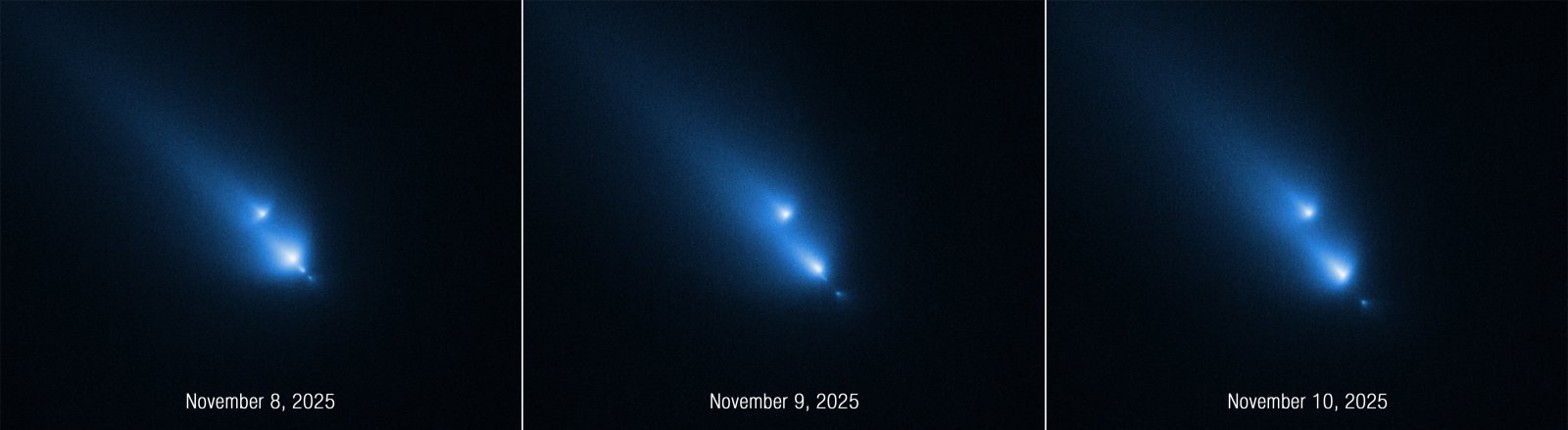 Kometa C/2025 K1 (ATLAS) právě minula bod svého nejbližšího přiblížení ke Slunci a směřovala ven ze Sluneční soustavy. V tu chvíli se na ni zaměřil největší optický kosmický teleskop HST. Ačkoli byla ještě před několika dny celistvá, kometa K1 se před zraky Hubbleova vesmírného dalekohledu provozovaném NASA a ESA rozpadla nejméně na čtyři části. Šance, že se toto stane zrovna když se na ni zaměří Hubble, byla opravdu mimořádně mizivá.