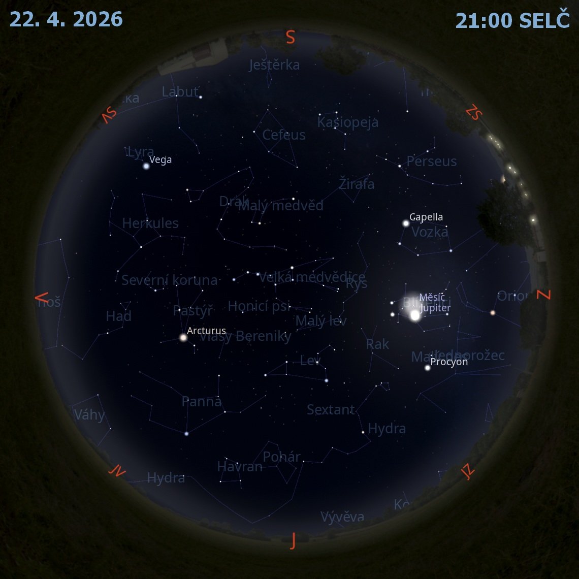 Planety viditelné okem: Večer pokračuje dobrá viditelnost planety Jupiter (-2,3 mag). Je v souhvězdí Ryb a právě míjí těsně Uran (5,9 mag), nyní jen půl stupně od něj. Obě planety se tedy pohodlně směstnají do zorného pole dalekohledu při malém zvětšení.