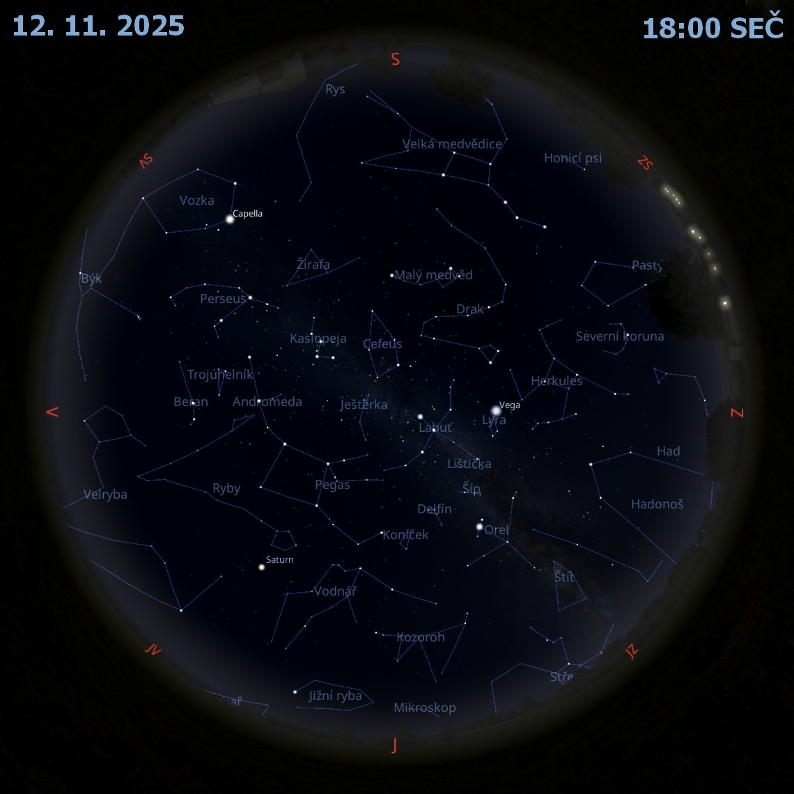 Planety viditelné okem: Večer pokračuje dobrá viditelnost planety Jupiter (-2,3 mag). Je v souhvězdí Ryb a právě míjí těsně Uran (5,9 mag), nyní jen půl stupně od něj. Obě planety se tedy pohodlně směstnají do zorného pole dalekohledu při malém zvětšení.