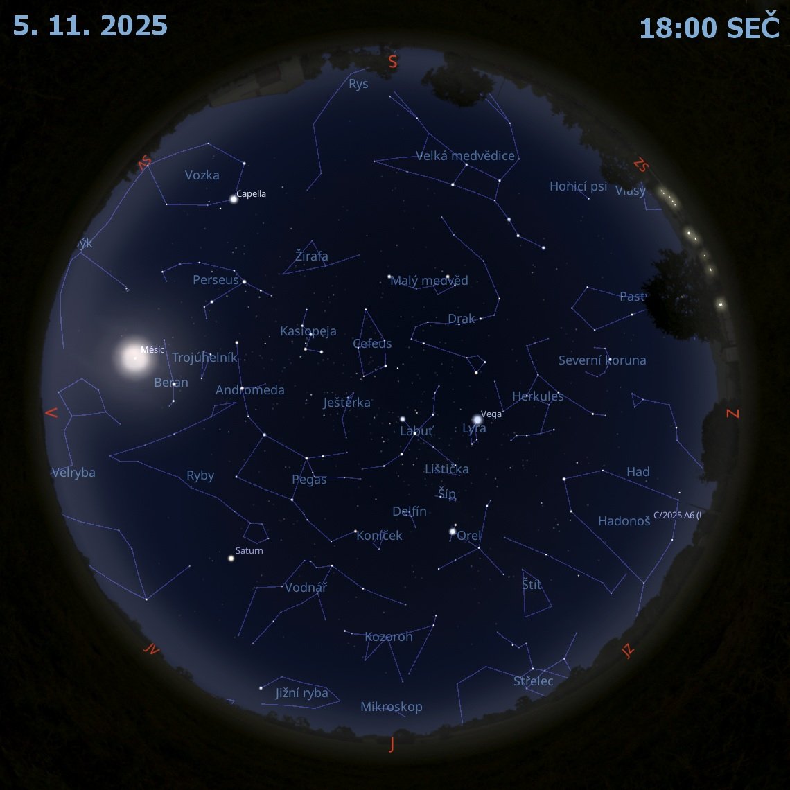 Ráno najdeme nevysoko na jihu Saturn (0,4 mag) a pomalu se objevuje „Jitřenka“ v podobě Venuše (–4,4 mag).