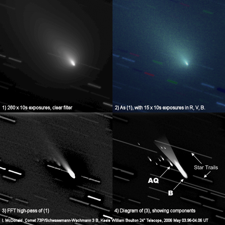 - Koncem dubna 2006 před pěti lety začaly být dobře viditelné fragmenty komety 73P/Schwassmann-Wachmann. Vzhledem k oběžné době 5,3 roku se komety opět přiblíží ke Slunci v letošním roce, ale návrat je to velmi nepříznivý. I v maximální jasnosti se neočekává, že budou jasnější 12 mag a navíc velmi nízko nad západním obzorem na podzim. Nicméně letos nás doufejme čekají jiné zajímavé komety.