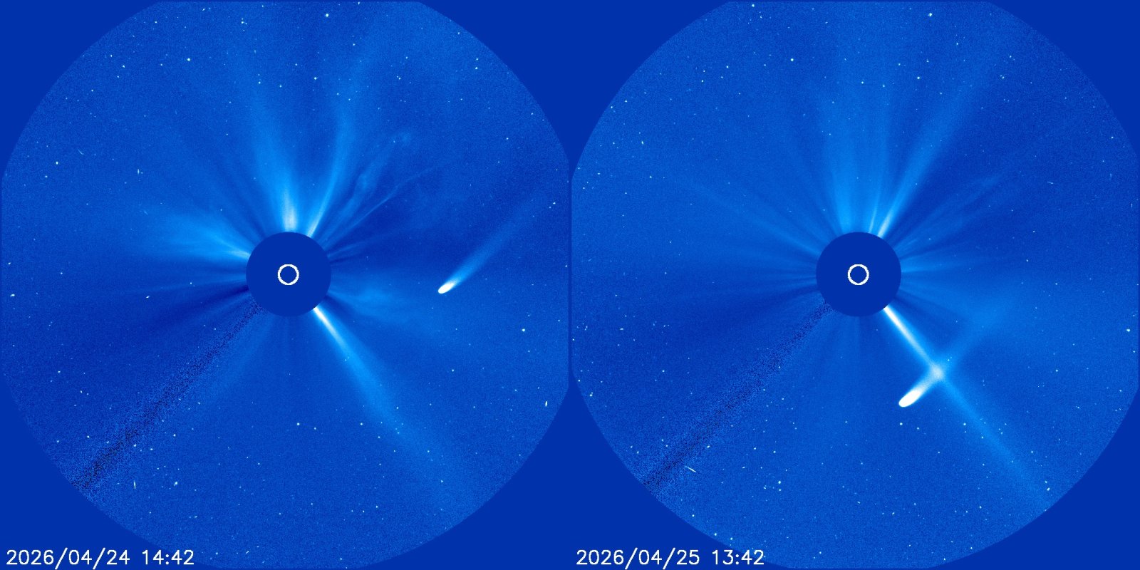 Kometa C/2025 R3 (PanSTARRS) se krásně předvedla v koronografech, když proletěla zdánlivě mezi Zemí a Sluncem. Dočasně zjasnila až přibližně k 1 mag. Od nás už není viditelná, ale až se vymaní ze záři Slunce, měla by být pozorovatelná na večerní obloze jižnějších oblastí nebo jižní polokoule.