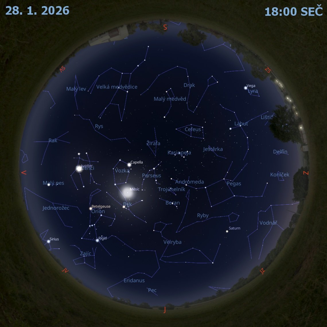 Saturn (0 mag) je vidět celou noc. Kulminuje kolem půlnoci ve výšce 21°.