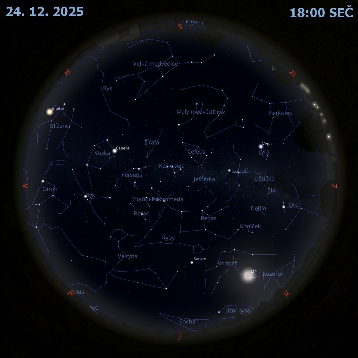 Přehled událostí na obloze a v kosmonautice od 15. 12. do 21. 12. 2025. Měsíc bude v novu. Nastává zimní slunovrat. Večer je nad jihem Saturn. Jupiter je vidět téměř celou noc, podobně jako Uran. Poblíž Saturnu je slabý Neptun. Ráno je velmi nízko na jihovýchodě Merkur. Aktivita Slunce se opět snížila. Stále je na obloze několik zajímavých slabších komet. Geminidy nyní budou slábnout. Astronauti mise Artemis II by měli testovat v lodi Orion. Raketa Atlas V poletí s dalšími družice konstelace Amazon Leo. Vrátila se tříčlenná posádka ISS v kosmické lodi Sojuz MS-27. Před 60 lety se na oběžné dráze nacházely v těsné blízkosti kosmické lodě Gemini 6A a Gemini 7.