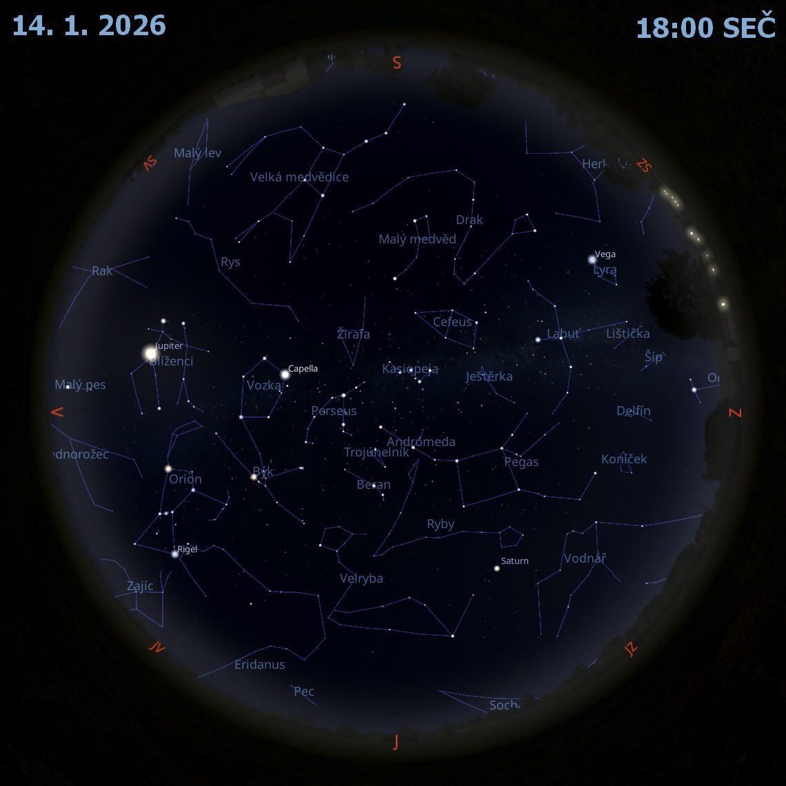 Jupiter (–2,7 mag) je vidět celou noc, protože v sobotu 10. ledna byl v opozici vůči Slunci.