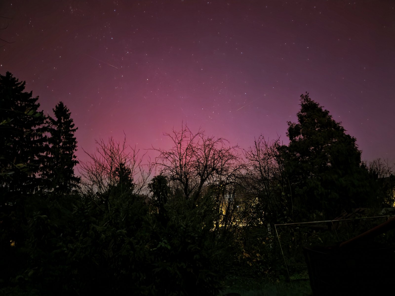 Aktivita Slunce je stále velmi vysoká. Na povrchu jsou i okem viditelné skvrny, a navíc dochází k erupcím doprovázeným výrony plazmatu z koróny. Tato hmota pak při příletu k Zemi způsobuje různě silné geomagnetické bouře. Polární záře byly zatím z kategorie fotograficky viditelných, ale může nastat i trochu jasnější. Sledujte dění třeba v aplikaci Spaceweatherlive. Pohled na skvrny nabízí také aktuální snímek SDO.