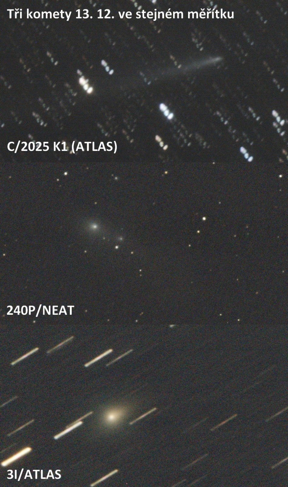 Slabší komety nadále zdobí různá místa na obloze. Večer v Rybách je už pod 12 mag zesláblá C/2025 R2 (SWAN). Vysoko na rozhraní Kasiopeji a Andromedy je slábnoucí opět více rozpadlá C/2025 K1 (ATLAS). Tím pádem bude asi i ona obtížnější, ale má poměrně dlouhý ohon, alespoň na fotografiích. V Orlu poblíž hvězdy Altair můžeme zkusit další slábnoucí kometu C/2025 T1 (ATLAS). Rozhodně stojí za vidění kometa 240P/NEAT. Jednak je docela pěkně vysoko v zadní části Býka, ale především má poblíž hlavního jádra poměrně jasný druhý úlomek. A konečně stále ještě můžeme vidět i mezihvězdnou kometu 3I/ATLAS. Mapky k vyhledání komet nabízí pozorovatelský server CzSkY.cz: C/2025 R2, C/2025 T1, 240P, C/2025 K1 a 3I/ATLAS.