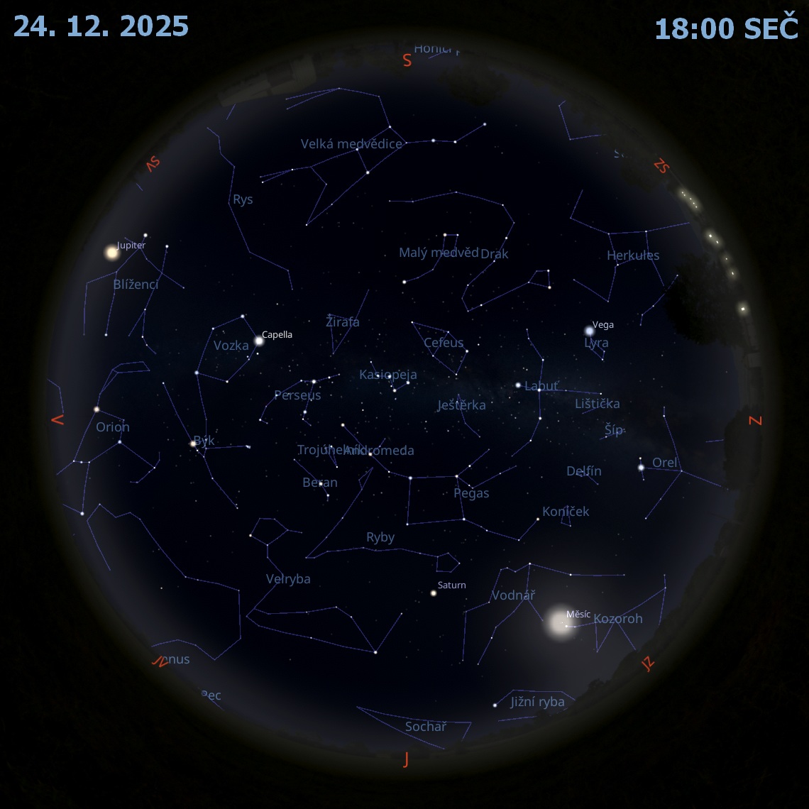 Výjimečný bude letošní Štědrý večer. Nejen z klasických důvodů, ale i astronomicky. Ve stejný okamžik, krátce před 18:00 SEČ totiž vstoupí na kotouč Saturnu měsíc Titan a na kotouč Jupiteru Callisto a Io, přičemž zde navíc uvidíme i stín Io.