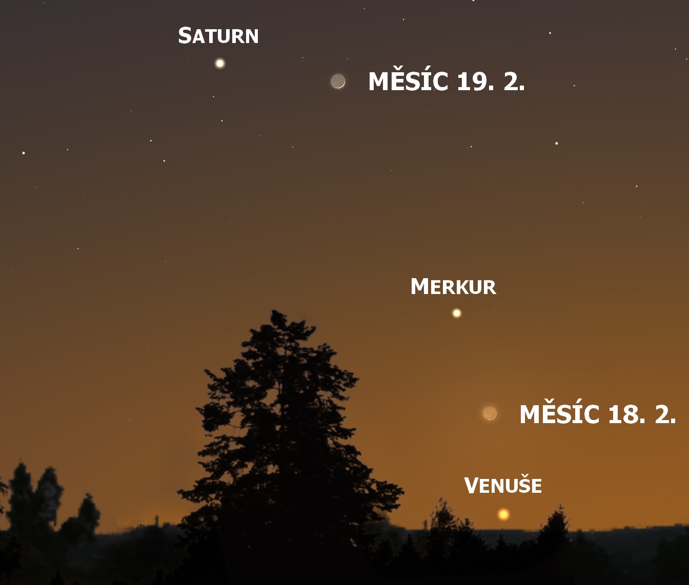 Měsíc bude v novu v úterý 17. 2. ve 13:01 SEČ. Velmi hezké by mohlo být seskupení 18. a 19. února na večerní obloze s Merkurem a Saturnem. Extrémně nízko by už navíc mohla být Venuše.