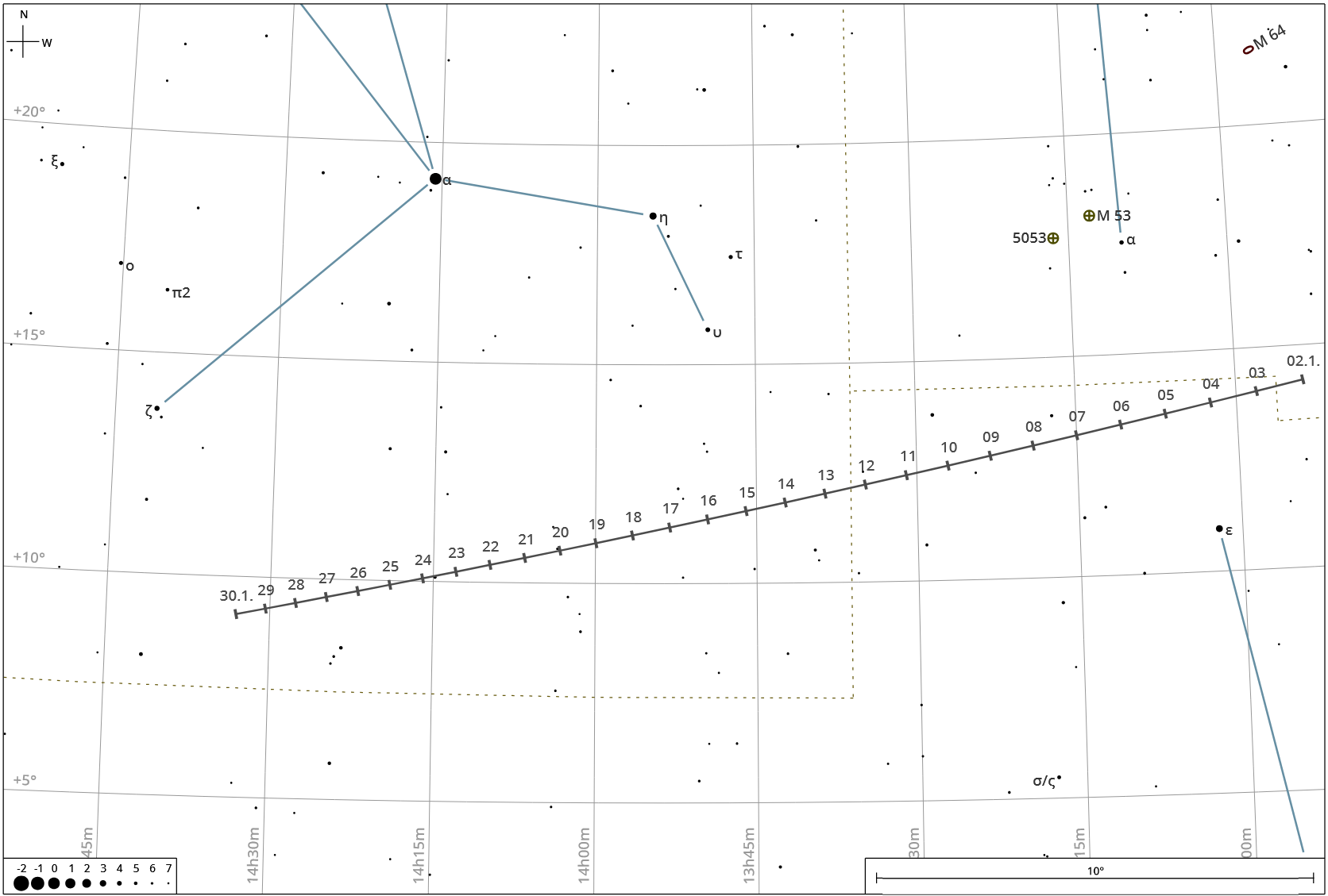 8. ledna je v přísluní kometa 24P/Schaumasse. Tato kometa se pravidelně vrací ke Slunci jednou za 8 roků. Její jasnost bude v lednu kulminovat kolem 9 mag, ale je poměrně difúzní, a tak to chce tmavou oblohu a velké zorné pole. Kometa je na fotografiích pěknou zelenou mlhavou koulí a pohybuje se přibližně pod Arkturem v Pastýři.