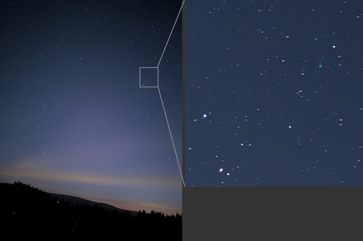 Pokud máme k dispozici tracker, tedy malou montáž schopnou hodinovým pohonem dorovnávat otáčení naší Země, hvězdy zůstanou na snímku jako tečky i s využitím teleobjektivu kolem 85–400 mm. Ideální vzhledem k délce ohonu se ale jeví objektivy od 50 do 200 mm. Pokud složíme dohromady více snímků, klesne šum a můžeme sledovat delší část ohonu.