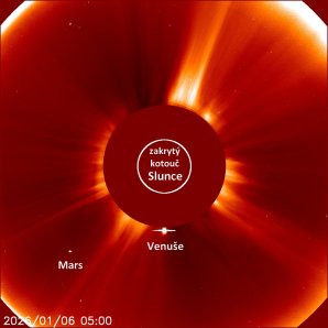 V lednu nám trochu skrytě našim zrakům nastává poměrně mimořádná konjunkce Venuše s Marsem a obě planety jsou navíc v konjunkci se Sluncem. Sice postupně, ale zato v odstupu jen několika dnů. A všechno to vlastně můžeme sledovat v přímém přenosu. Díky snímkům kosmických observatoří v čele s historicky nejdéle pracující SOHO.