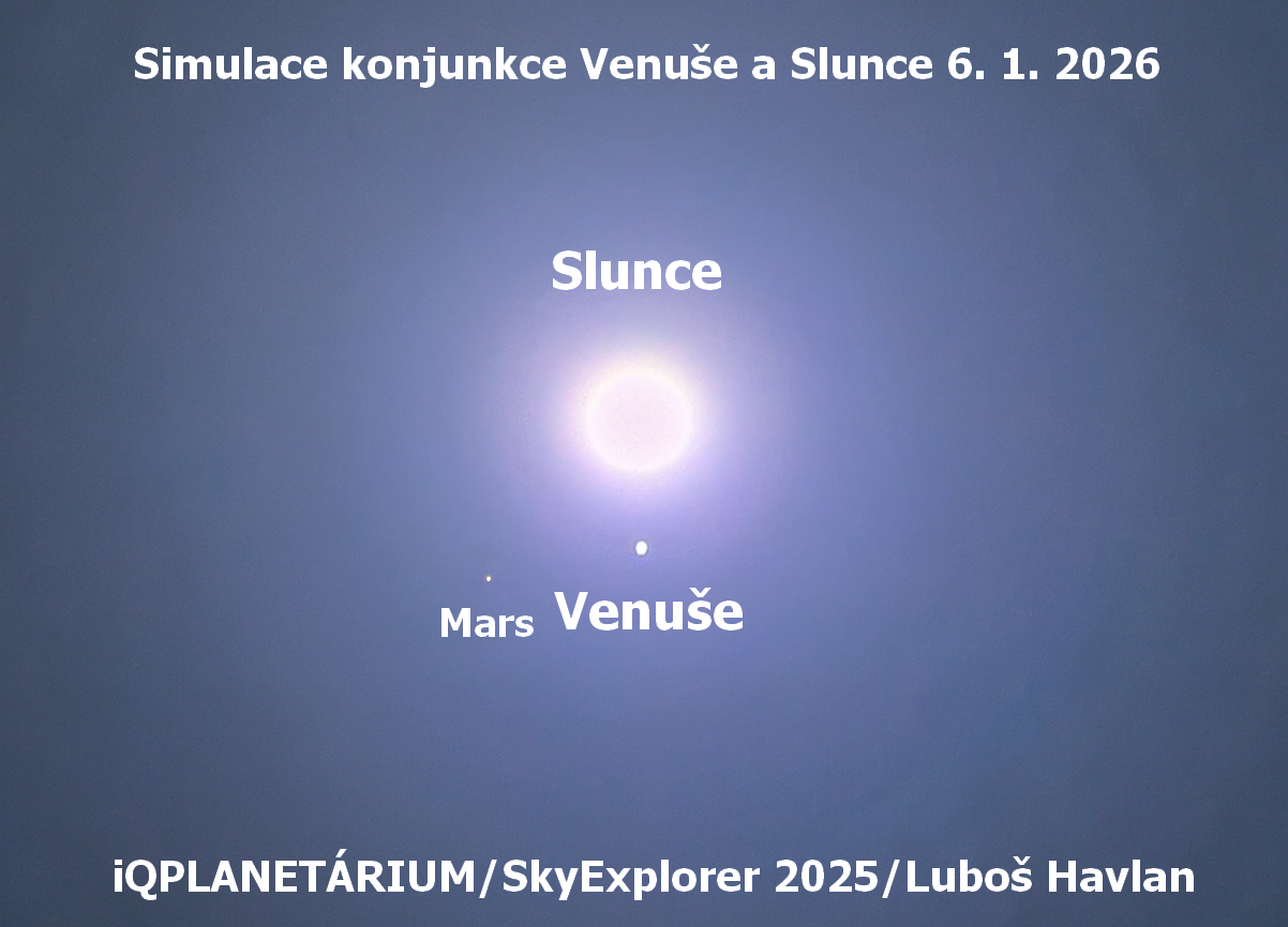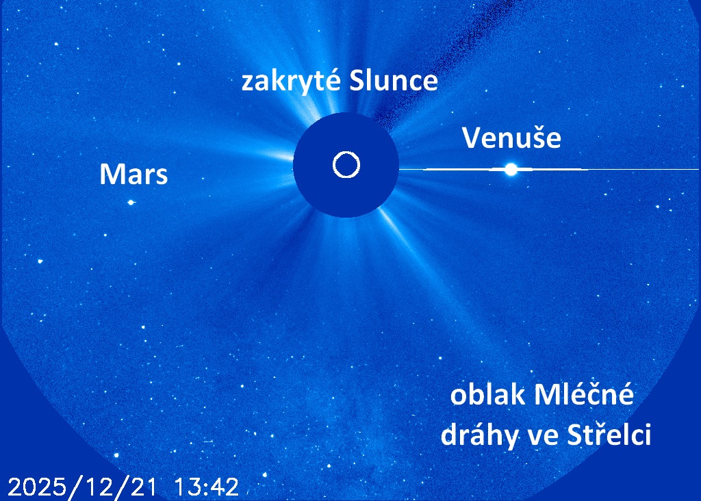 Jak jsme již viděli na reálné fotografii z observatoře SOHO, v lednu 2026 nastává poměrně výjimečná trojitá konjunkce planety Venuše s Marsem, a navíc oblou planet se Sluncem. Tento jev ale nejde pozorovat přímo a musíme si vystačit se záznamem z koronografu. Koronograf je speciální dalekohled umožňující pozorování sluneční koróny a protuberancí. Tento dalekohled vyžaduje prostředí se sníženou prašností, proto ho najdeme ve vysokých horách nebo na vesmírných observatořích. Slunce je v něm zakrýváno terčíkem v ohniskové rovině objektivu.