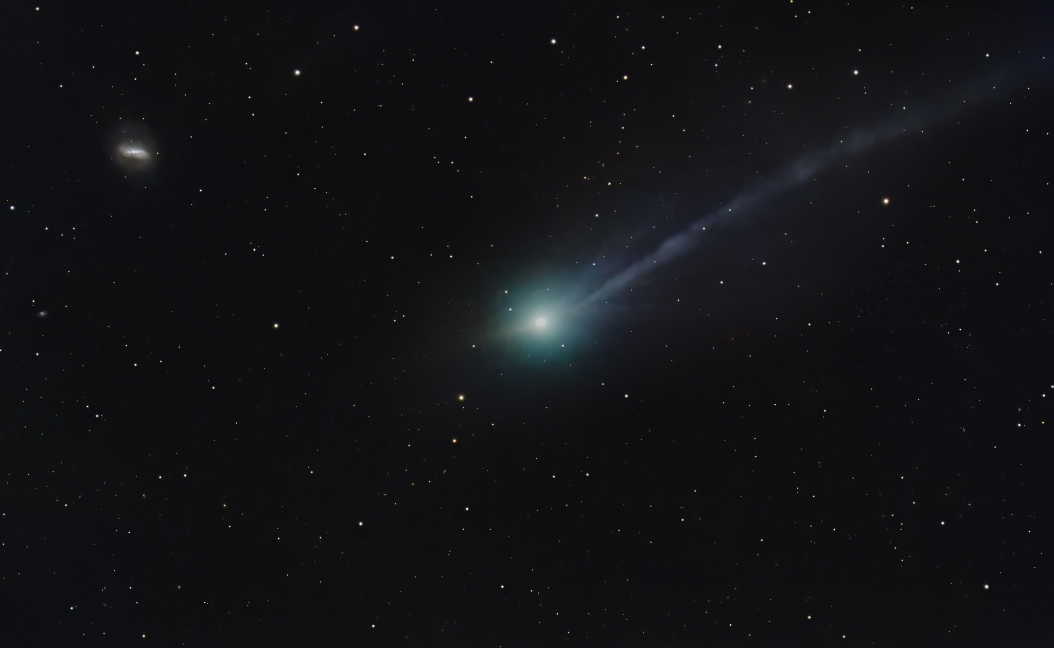 Fotografie z 16. listopadu (úvodní snímek), kterou pomocí vzdáleně ovládaného dalekohledu v Novém Mexiku pořídil Satoru Murata je dosud jedním z nejlepších ukázek, že 3I/ATLAS je klasická kometa. Tedy alespoň na první pohled. Vidíme typickou zelenou komu (hlavu komety), modrý iontový ohon modelovaný slunečním větrem (je krátký, neboť z našeho úhlu pohledu se promítá trochu za kometu) a dále vidíme krátký protichvost, tedy prach v rovině dráhy komety. Těžší prachové částice, které jsou vidět, protože je kometa za sebou zanechává a my se nyní pohybujeme se Zemí téměř v rovině dráhy komety a v takové chvíli je protichvost často dobře viditelný.