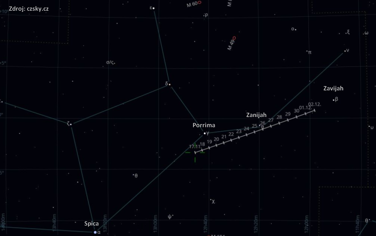 V týdnu od 17. 11. ji najdeme poblíž hvězdy gama Virginis, zvané Porrima, která je jednou z nejvýraznějších hvězd souhvězdí Panny. Za týden se přiblíží éta Vir, Zanijah a na začátku prosince, než začne vadit Měsíc v úplňku, ji najdeme poblíž bety Vir, Zavijah. Kdo se příliš neorientuje, může použít aplikace jako je Stellarium, nebo náš skvělý domácí web pro pozorovatele CzSkY.cz. Mapu k vyhledání komety si zde snadno zobrazíte kliknutím v seznamu právě viditelných komet i s aktuálními údaji o přibližné jasnosti podle hlášení pozorovatelů.