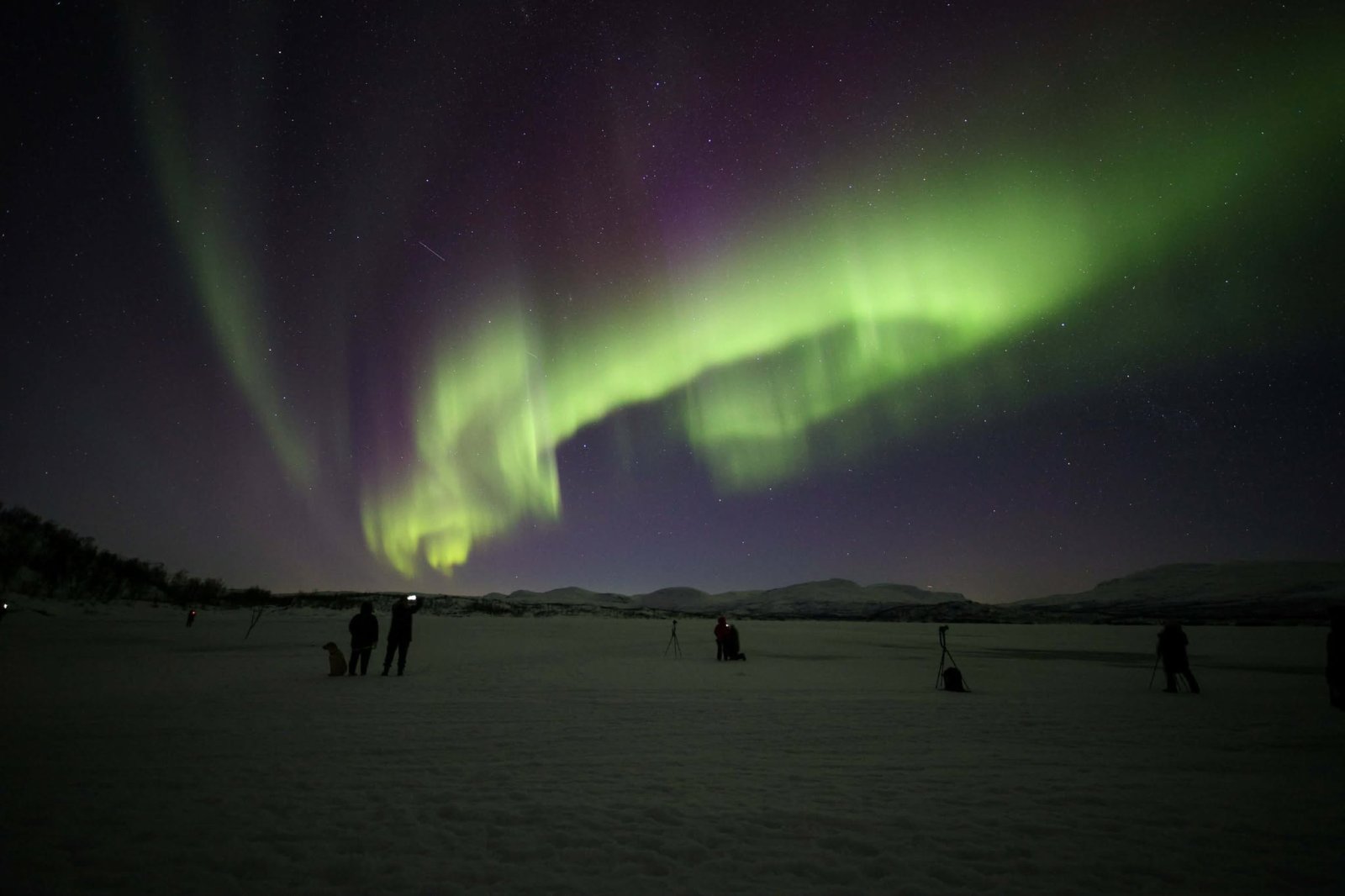 Typickým záběrem z počátku noci je i fotografie Davida Černého. Nahoře u kraje snímku je Polárka, zatímco níže dole vlevo se v záři úplně topí Velký vůz. Všimněte si, že u obzoru je vidět i níže ležící zelená záře tvořená kyslíkem, k jehož excitaci, vybuzení ke svícení, je v nižší vrstvě atmosféry třeba méně energie, než k excitaci kyslíku ve vyšších a řidších vrstvách atmosféry. Výše však kyslík vyzařuje v červené oblasti spektra.