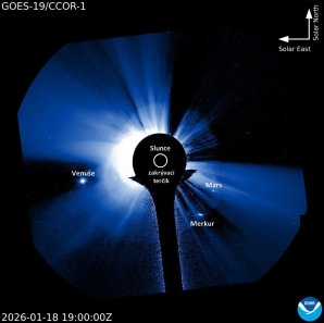 V lednu 2026 bylo Slunce poměrně aktivní už od začátku roku, ale vědělo se, že asi ta nejaktivnější oblast je ukryta na odvrácené polokouli. S tím, jak se Slunce otáčelo, pozorovali jsme velké erupce, ke kterým tam docházelo, protože do opačné části Sluneční soustavy byla vyvrhována oblaka plazmatu. Jenže ta mířila spíš k Venuši a Marsu, což jsou planety nyní viditelné jakoby za Sluncem v koronografu SOHO nebo CCOR-1 na GOES-19, což jsou vesmírné dalekohledy sledující Slunce.