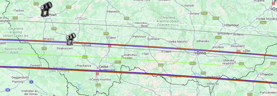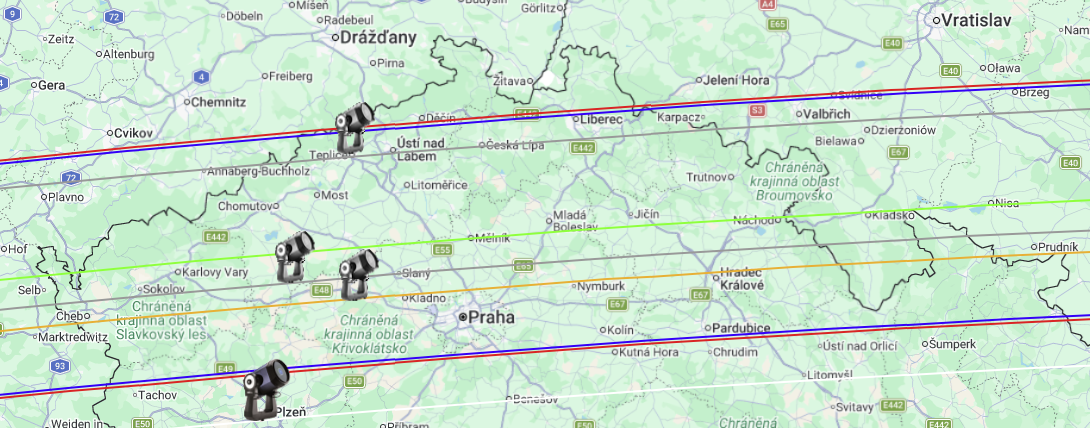 A kam svůj evscope (nebo jiný dalekohled) postavit? Na to nejlépe odpoví připojená mapa. Centrální linie zákrytu vstoupí na naše území z Německa poblíž Železné Rudy ve 20:06:07 UT a opustí ho po 13 sekundách (20:06:20 UT) poblíž Starého Hrozenkova. Předpověď zdá se být poměrně přesná, modré čáry vymezující okraje pásu a ty červené, vyjadřující velikost chyby předpovědi 1-sigma, téměř splývají. Úkaz má i mnoho dalších výhod, odehraje se v pohodlné výšce 38° nad ZJZ obzorem (azimut 248°) se Sluncem i Měsícem hluboko pod obzorem. Ani majitelé jiných dalekohledů by neměli mít s vyhledáním pole problém. Stačí ho namířit na alfu souhvězdí Býka Aldebaran a popojet v rektascenzi o 20 minut na východ.
