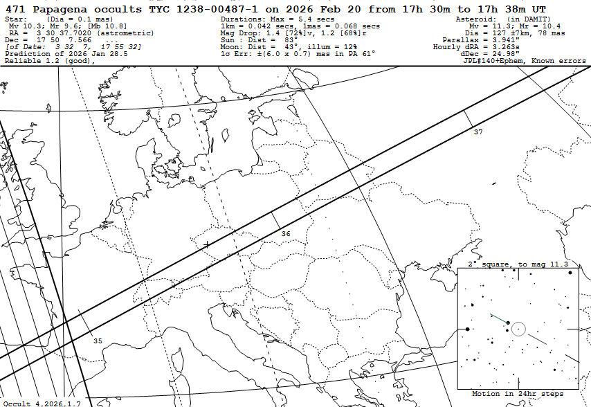 V pátek večer 20. února 2026 mezi 17:35:40 a 17:35:52 UT protne dle předpovědi naše území pás stínu 127 km velké planetky (471) Papagena. Ta z našeho pohledu zakryje relativně jasnou hvězdu TYC 1238-00487-1 (10,3 mag.) v souhvězdí Býka. Úkaz se odehraje vysoko nad JJZ obzorem (azimut 204, výška 56 stupňů) a měl by být v dosahu i menších dalekohledů, kde hvězda na maximálně 5,4 sekundy zmizí. Ve větších přístrojích pouze pohasne - předpokládaný pokles jasnosti je 1,4 magnitudy.