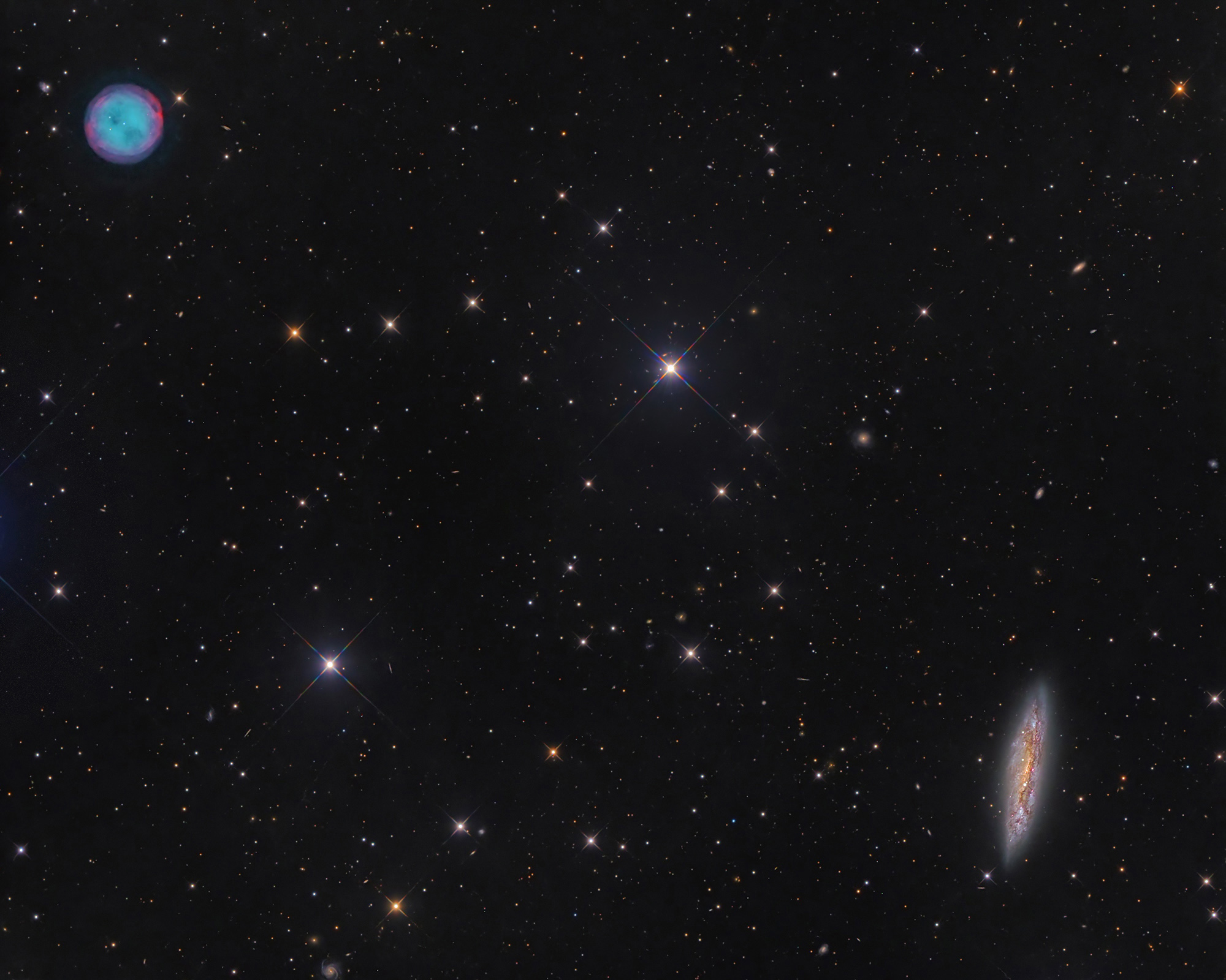 Popis: Dva zcela rozdílné objekty v jednom poli pod Velkým vozem: planetární mlhovina M97 (také Soví mlhovina) a galaxie M108.