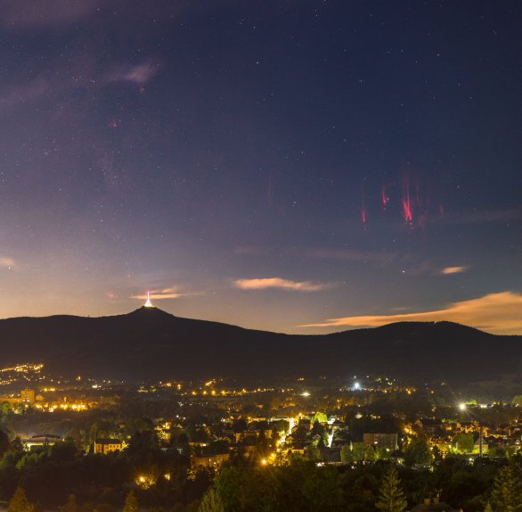 Popis: 4. 9. 2025 večer se naskytla poměrně nečekaná šance vyfotit rudé skřítky. Bouřky, ze kterých tito skřítci pocházeli, se nacházeli asi 350 km daleko, v poměrně dlouhé linii nad Bavorskem. Podařilo se mi jich zachytit několik, ale ostatní byly podstatně slabší. Pro porovnání jsem do snímku přidal ještě jednoho skřítka, kterého jsem zachytil 14 minut před tím obrovským. Pro mě to byl první úspěšný pokus, a tak jsem za něj nesmírně rád. Ještě navíc jsem měl štěstí, že se podobným směrem nacházel i samotný Ještěd, a dokonce i Mléčná dráha, která je i na tomto snímku z města dobře vidět (mlhovina Laguna je jen kousek od samotného hotelu Ještěd) - a to i přesto, že kousek vedle svítil skoro úplňkový Měsíc.