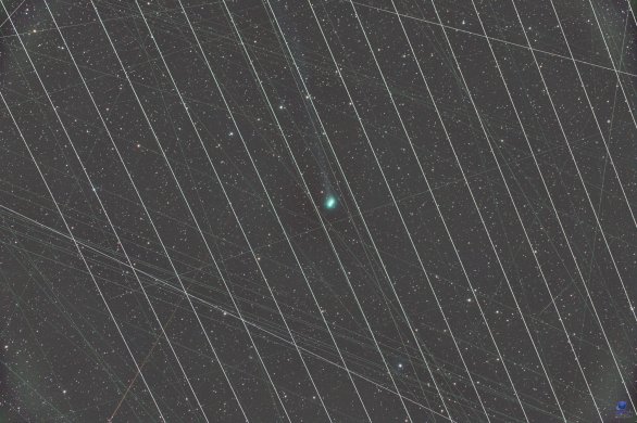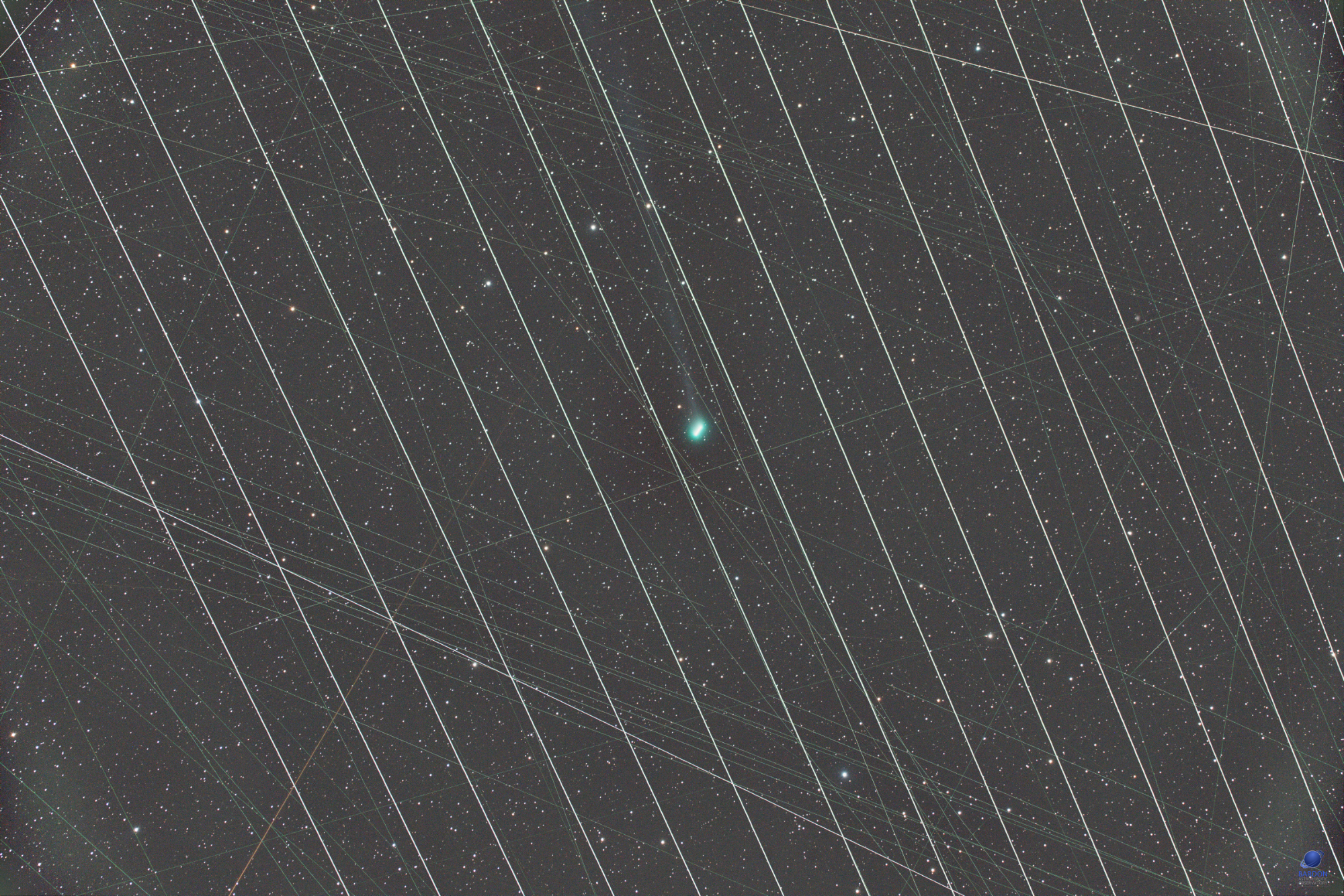 Popis: Pokus o nasnímání komety C/2025 A6 Lemmon. Poskládáno 29x60sec snímků. Výsledný obraz zobrazuje nejen trajektorii komety, ale i značné množství drah satelitů. Zatímco okolní města a vesnice (v mém případě) v důsledku výměny veřejného osvětlení viditelně pohasla, tak na obloze je stále více satelitů a už neexistuje snímek bez drah satelitů. S jistotou lze konstatovat, že to bude jen horší a nelze s tím nic udělat.