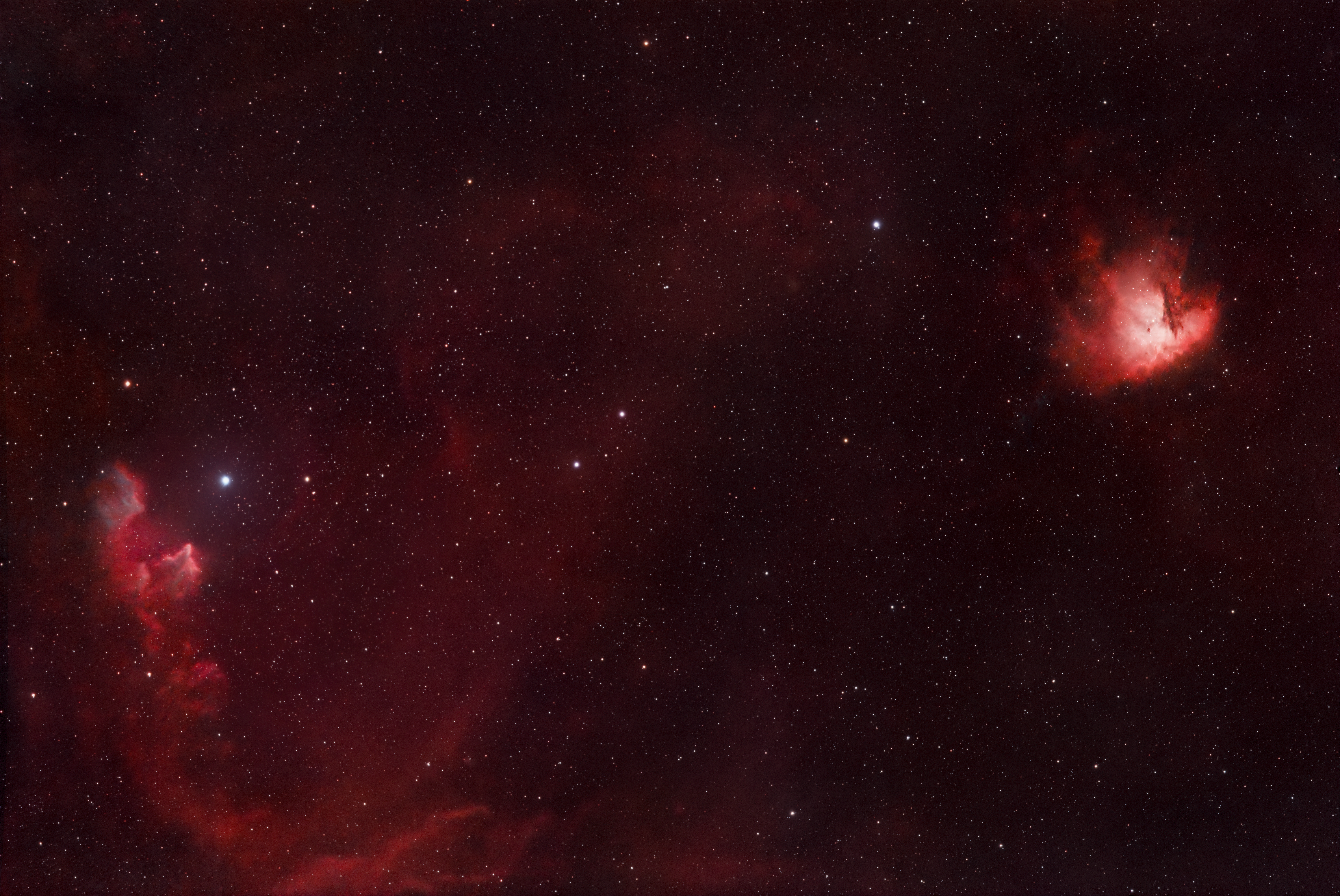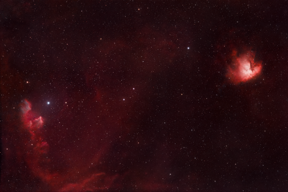 Popis: Kompozici obou mlhovin jsem chtěl zachytit už dávno a jasné bezměsíčné noci v polovině září nahrávaly tomu to konečně zkusit. Upřímně jsem se trochu obával jestli to bude vypadat dobře a vzhledem k tomu, že nepoužívám montáž s funkcí GO TO jsem odkázán na manuální zacentrování. Noc byla relativně teplá a já byl připravený z ní vytěžit maximum. Připravil jsem vercajk, zaměřil Polaris a čekal na úplnou tmu. Písmeno W se začínalo rýsovat na severním obzoru a já pomalu zacílil svým novým objektivem do vybrané oblasti. Prvních pár test shotů na vysoké ISO a už se tam rýsovaly základní kontury obou mlhovin. Přemýšlel jsem nad časem a nejprve jsem zkusil 1min30 sek dlouhou expozici. Zdálo se mi to málo, tak jsem to nakonec zvedl na \"bezpečné\" 2min30 sek. Manual dithering cca každých 5-8 snímků. Noc uplynula jako voda a já skončil s celkem asi 6 hodinami dat, vzhledem k rychlé cloně jsem doufal, že to bude právě výhoda, která umožní z toho dostat maximum i za relativně krátký čas...podle výsledku se zdá, že...stačilo.