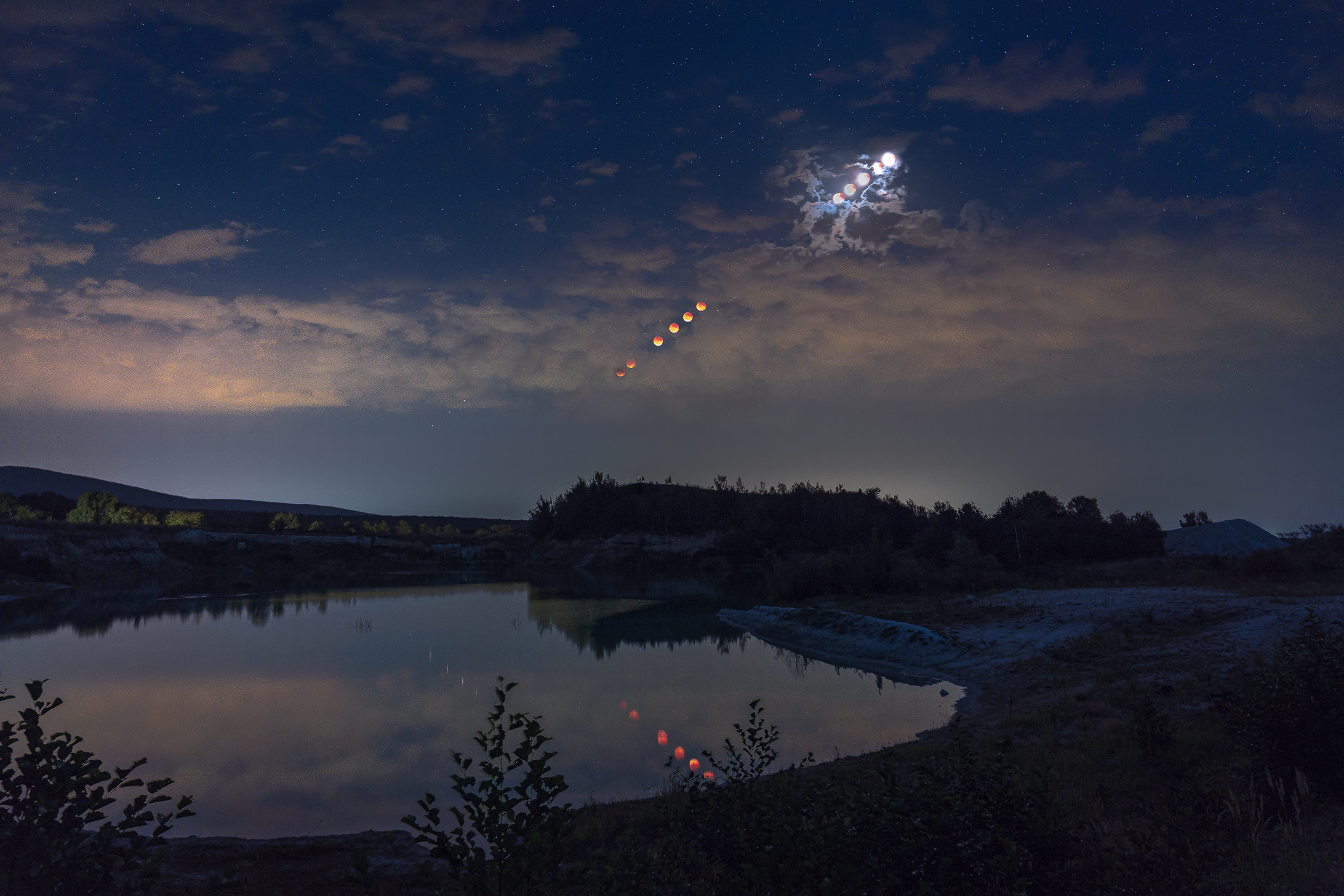 Popis: Toto je kombinácia 11 jednotlivých snímok vybraných z celej sekvencie, keď Mesiac nebol počas úplného zatmenia zakrytý mrakmi. Cieľom bolo zachytiť aj odraz Mesiaca vo vode a nebyť nepriaznivého počasia, výsledok mohol byť ešte lepší. Napriek tomu sa mi výsledok páči a som vďačný, že nebolo úplne zamračené. Na oblohe a v odraze na vodnej hladine je vidieť aj planétu Saturn. Pod mesačnou postupkou si je ešte možné všimnúť na kopci postavičky ľudí, ktorí sa tiež snažili tento výnimočný úkaz pozorovať a fotografovať.