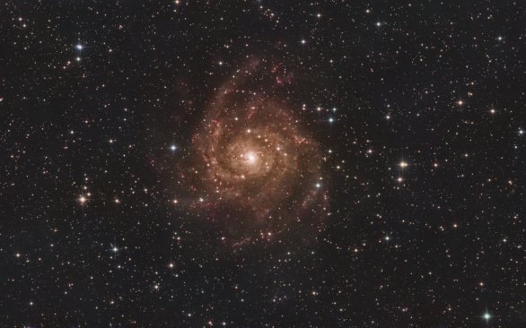 Na zábere krásne vyniká žiarivé, žltkasté jadro a jemné špirálové ramená, ktoré sa rozbiehajú do všetkých strán. V nich vidno červené H II oblasti – miesta, kde sa práve rodia nové hviezdy – a modrastejšie mladé hviezdokopy. Popredie tvorí husté pole hviezd našej vlastnej Galaxie; len vďaka dlhým expozíciám a citlivému spracovaniu sa cez tento „závoj“ podarilo vytiahnuť aj slabé vonkajšie ramená a prachové štruktúry disku.
