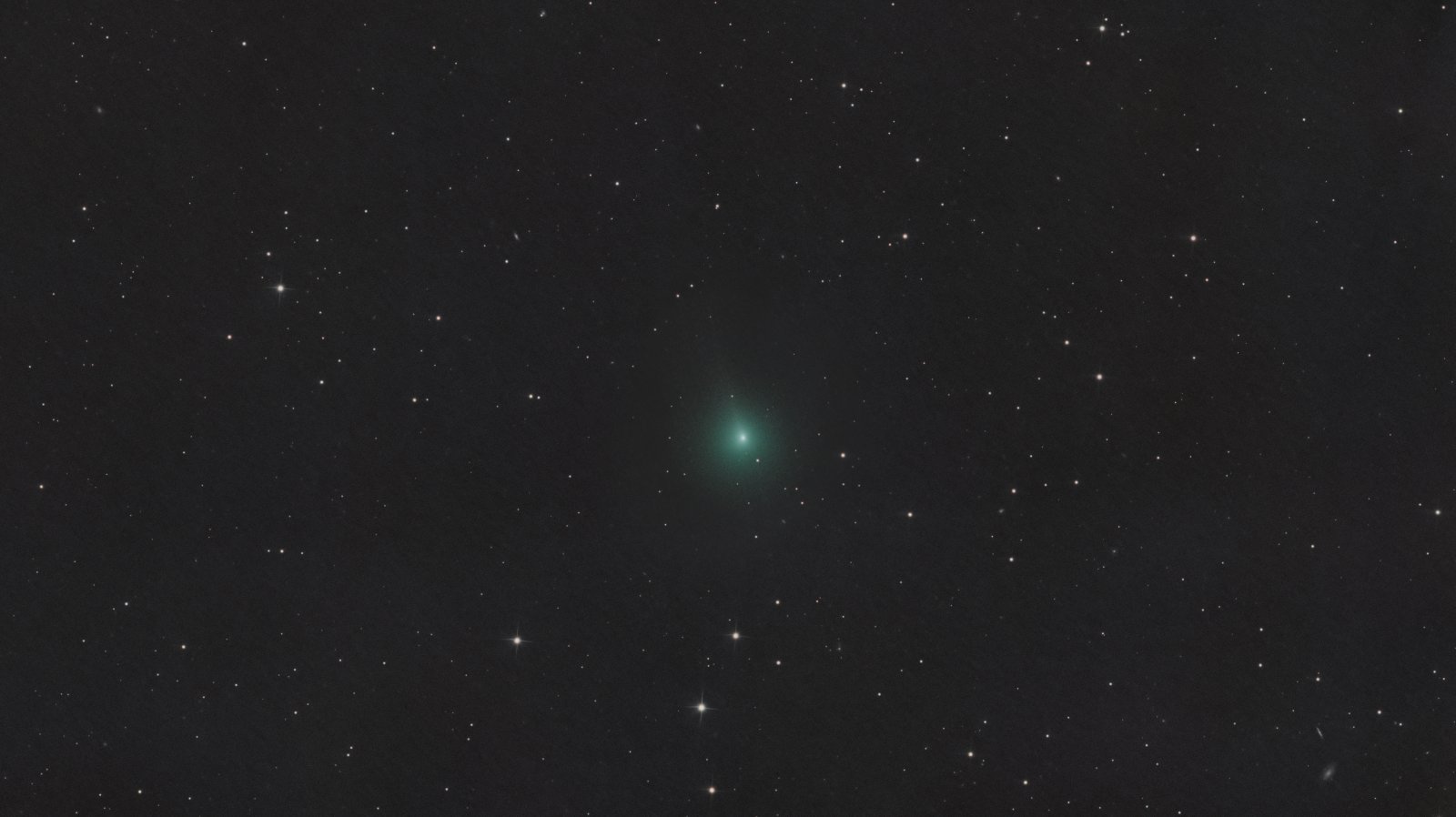 Kométa 24P/Schaumasse zachytená 19. januára 2026 v skorých ranných hodinách, ešte pred svitaním. Na prvý pohľad pôsobí nenápadne, no v strede záberu vyniká jemne zelenkastá koma – oblak plynov a prachu, ktorý sa uvoľňuje zo zmrznutého jadra kométy pri priblížení k Slnku. Jemný náznak chvosta sa stráca v pozadí hviezdneho poľa a pripomína, že kométa je „živý“ objekt: z noci na noc mení polohu aj vzhľad. Zaujímavý kontrast dotvára aj drobná vzdialená galaxia na okraji záberu – statické hlboké pozadie oproti objektu, ktorý prelieta našou Slnečnou sústavou. Technické údaje: Vybavenie: SkyWatcher NEQ6Pro, GSO Newton 200/800 (200/600 F3) + Starizona Nexus 0.75×, Touptek ATR585M mono, AFW-M + Touptek LRGB filtre, Gemini EAF, guiding TS Off-axis + PlayerOne Ceres-C, SVBony 241 power hub, automatizovaná astrobúdka s mojím vlastným OCS (Observatory Control System). Software: NINA, Astro Pixel Processor, PixInsight, Adobe Photoshop. Expozície: LRGB 18x60sec. na každý kanál, master bias, flats, darks, darkflats. Gain 150, Offset 300. 19.1.2026 Belá nad Cirochou, severovýchod Slovenska, bortle 4