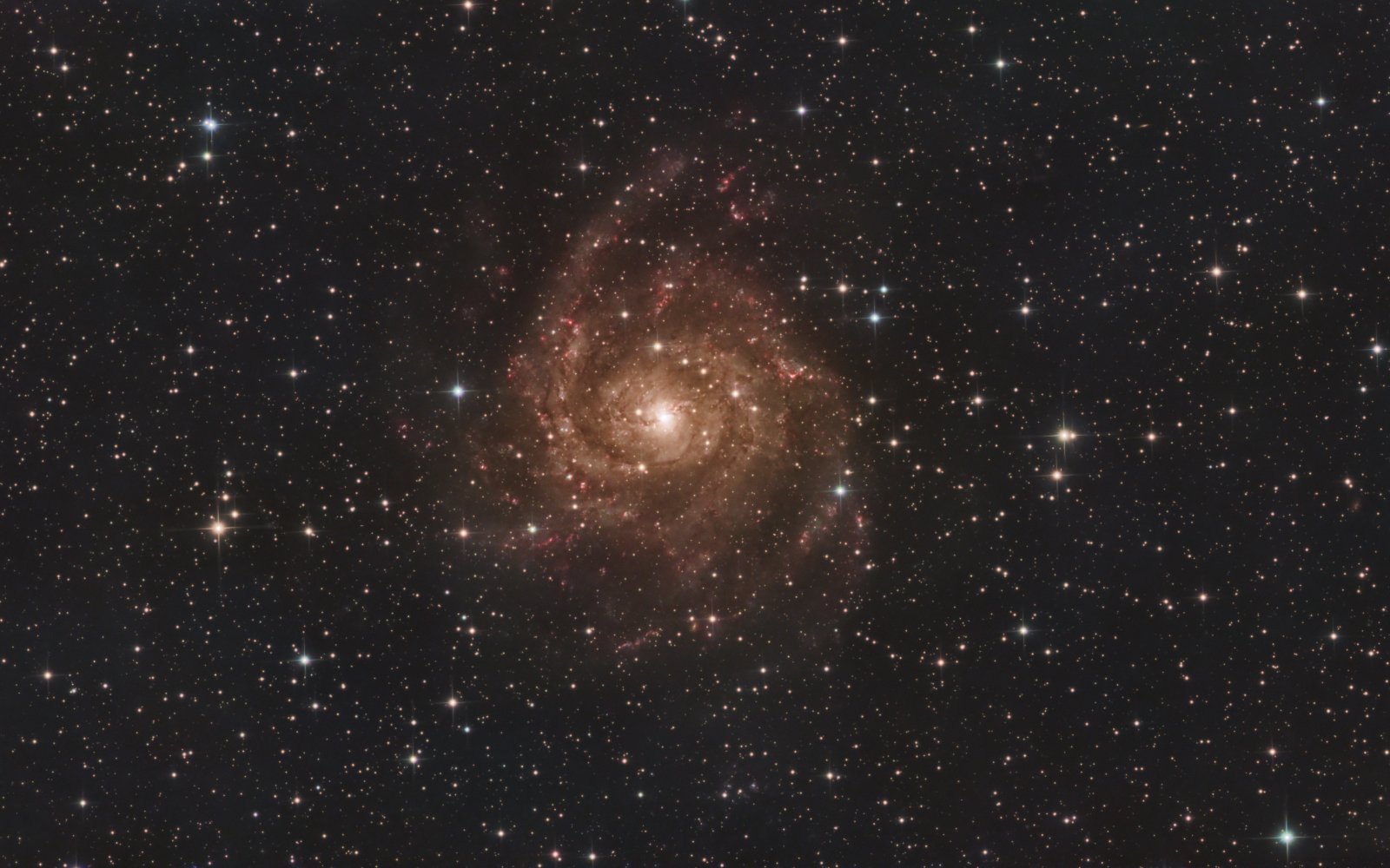 IC 342 – skrytá špirálová susedka Na prvý pohľad to vyzerá „len“ ako ďalšia špirálová galaxia v hviezdnom poli. IC 342 je však trochu výnimočná – keby neležala tak nízko v rovine našej Galaxie a nebola zahalená prachom Mliečnej cesty, patrila by k najvýraznejším objektom severnej oblohy. Aj preto sa jej hovorí „skrytá galaxia“. Na zábere krásne vyniká žiarivé, žltkasté jadro a jemné špirálové ramená, ktoré sa rozbiehajú do všetkých strán. V nich vidno červené H II oblasti – miesta, kde sa práve rodia nové hviezdy – a modrastejšie mladé hviezdokopy. Popredie tvorí husté pole hviezd našej vlastnej Galaxie; len vďaka dlhým expozíciám a citlivému spracovaniu sa cez tento „závoj“ podarilo vytiahnuť aj slabé vonkajšie ramená a prachové štruktúry disku. IC 342 sa nachádza asi 10 miliónov svetelných rokov od nás a spolu s ďalšími galaxiami tvorí tzv. skupinu IC 342/Maffei – jednu z najbližších galaktických susedstiev Mliečnej cesty. Tento snímok tak zachytáva pohľad cez vlastnú Galaxiu hlboko do kozmickej „ulice“, kde sa točí ďalší ostrov hviezd podobný nášmu. Vybavenie: SkyWatcher NEQ6Pro, GSO Newton astrograf 200/800 (200/600 F3), Starizona Nexus 0.75x komakorektor, Touptek ATR585M, AFW-M, Touptek LRGBH filtre, Gemini EAF focuser, guiding TS Off-axis + PlayerOne Ceres-C, SVBony 241 power hub, automatizovaná astrobúdka s mojím vlastným OCS (observatory control system). Software: NINA, Astro pixel processor, GraXpert, Pixinsight, Adobe photoshop Lights 96x180sec. R, 90x180sec. G, 88x180sec. B, 115x120sec. L, 95x600sec Halpha, master bias, flats, master darks, master darkflats Gain 150, Offset 300. 20.9. až 19.11.2025 Belá nad Cirochou, severovýchod Slovenska, bortle 4