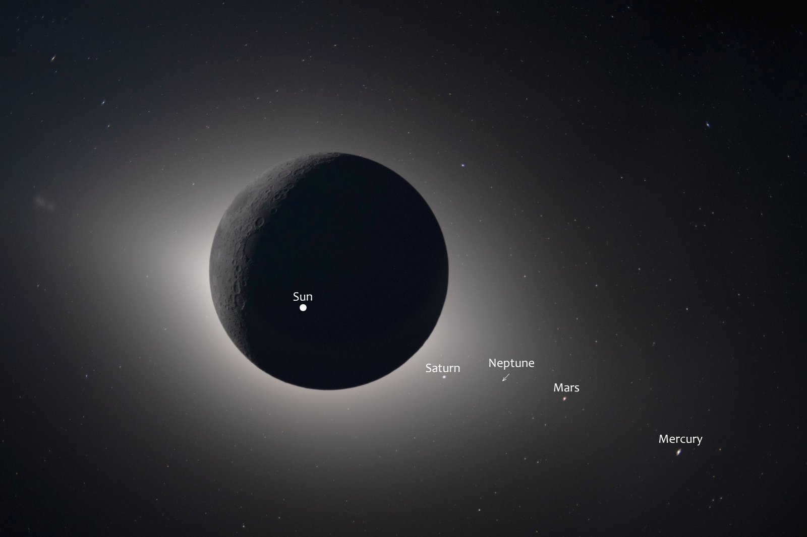 Posádka mise Artemis II posílá na Zemi unikátní snímky Země i Měsíce. Jeden z nejpozoruhodnějších je zvláštní zatmění, kdy Měsíc zakryl Slunce, ale srpek Země ležící vlevo mimo záběr osvětlil část jeho povrchu. Vpravo od Měsíce je vidět tři planety, které jsou úhlově blízko Slunci. Saturn, Mars a Merkur (jasnější tečky).
